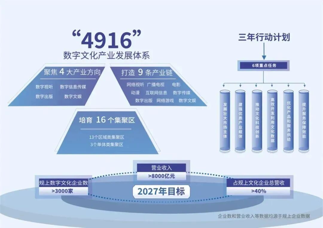 江苏,千年文脉奔涌不息,为数字文化产业发展积攒了丰厚家底。近年来,江苏深入贯彻落实党的二十届四中全会精神,贯彻落实国家关于发展数字经济和国家文化数字化战略的决策部署,顺应产业数字化和数字产业化发展趋势,推动全省数字文化产业高质量发展,各城市与企业各展所长,逐步构建起多样化的数字文化产业集群。今年7月,《江苏省数字文化产业高质量发展三年行动计划(2025—2027年)》(简称《行动计划》)正式出台,围绕四大产业方向,布局九条重点产业链,培育十六个产业集聚区,构建起“4916”发展体系。