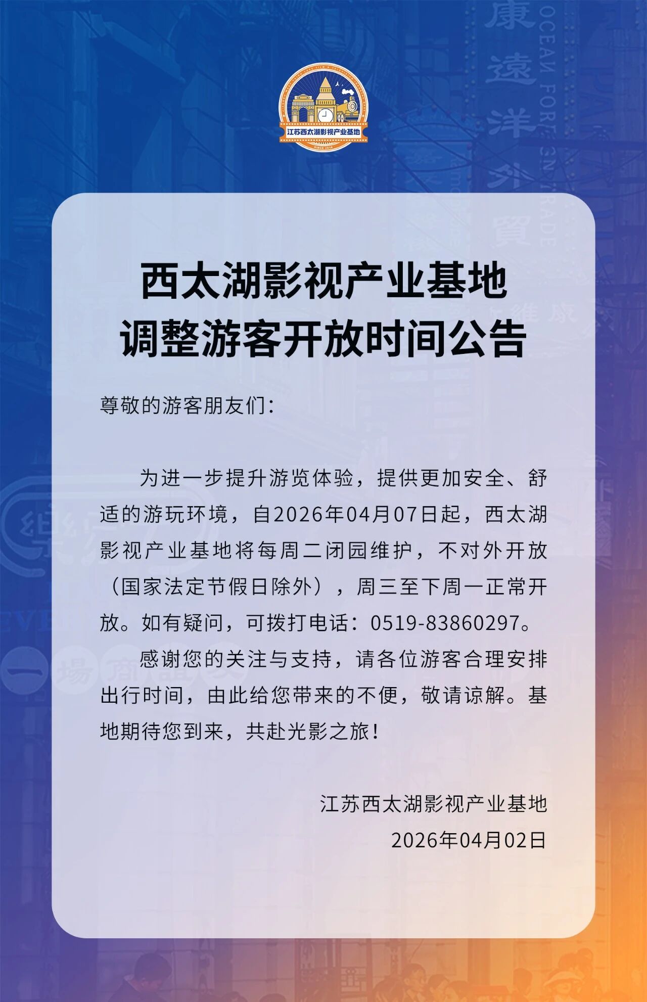 西太湖影视产业基地调整游客开放时间公告:每周二闭园维护